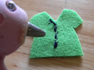 I chose a solid green felt so I decided to stitch buttons down the front. Notice I did not do this on the pink/white polka dot felt.